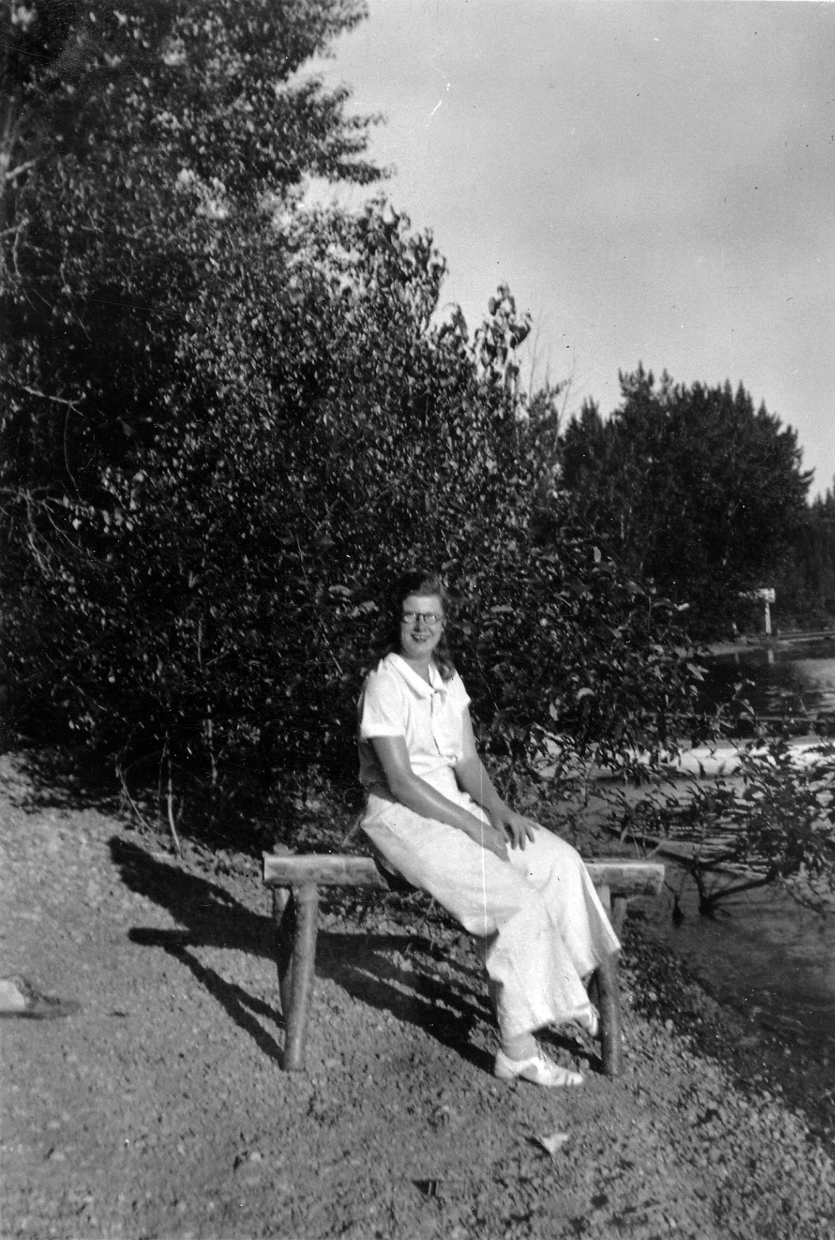 Y: july 4, 1934 D: diantha mckay, twin lakes idaho; as teen, on seat at edge of lake, looking at camera. [related 005-02-31, 059-008-31] C: diantha; twin lakes, idaho; 7-4-34.