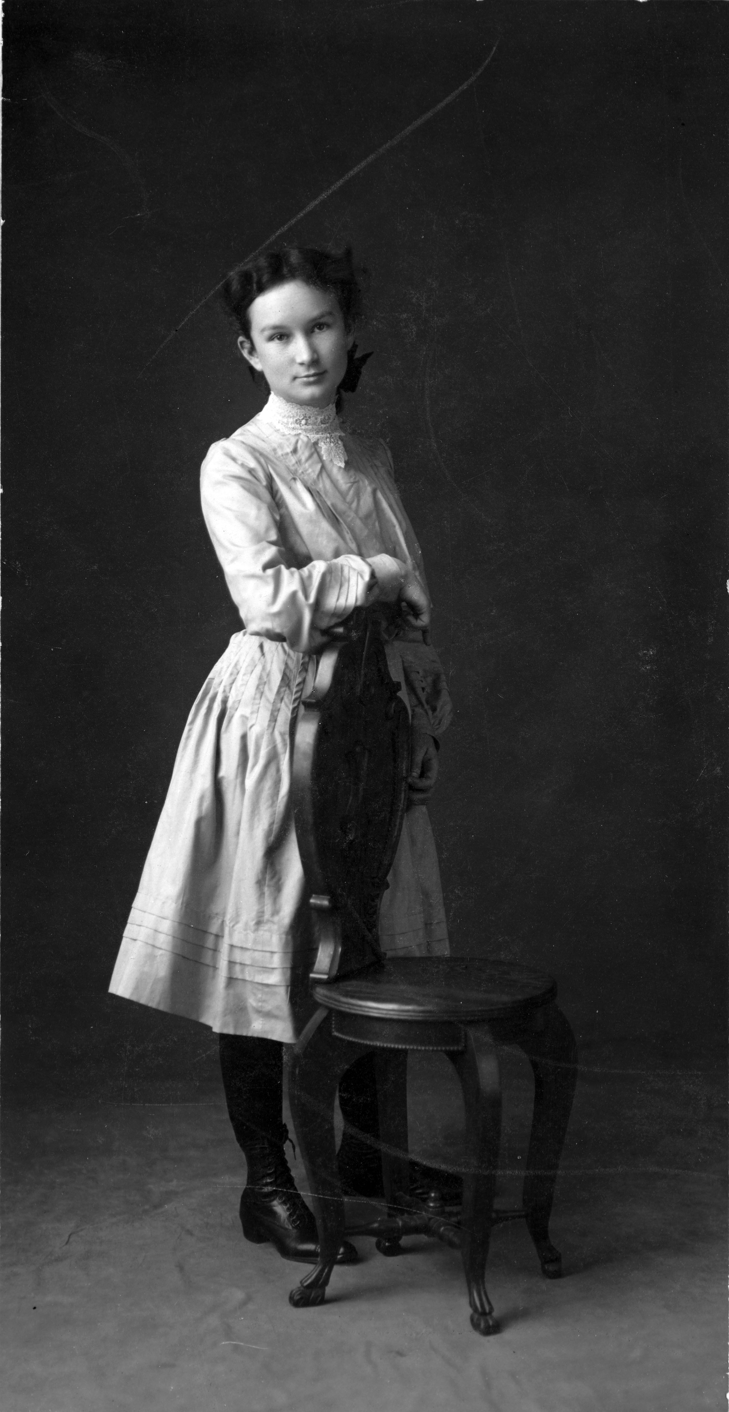 Y: 1905? D: 6-9: four lg. pics of schumaker daughters (doris, beth, adele, helen) C: doris schumaker; wsc home ec. specialist; never married; no children synthesis of COMMENTS for all 4 photos, 6-9: my [eloise mckay ruud] cousin; parents: carrie pangborn, john schumaker; meat market/butcher, of palouse & ballard; grandparents: howard pangborn, alice eliz. pratt pangborn her father, john schumaker, made money as a butcher in palouse - moved to Ballard --- bought a piece of city property; lease money supported the family; we visited them during the world fair; alaska [?]. [spelling of name in eloise mckay ruud comments is sometimes schumacher]