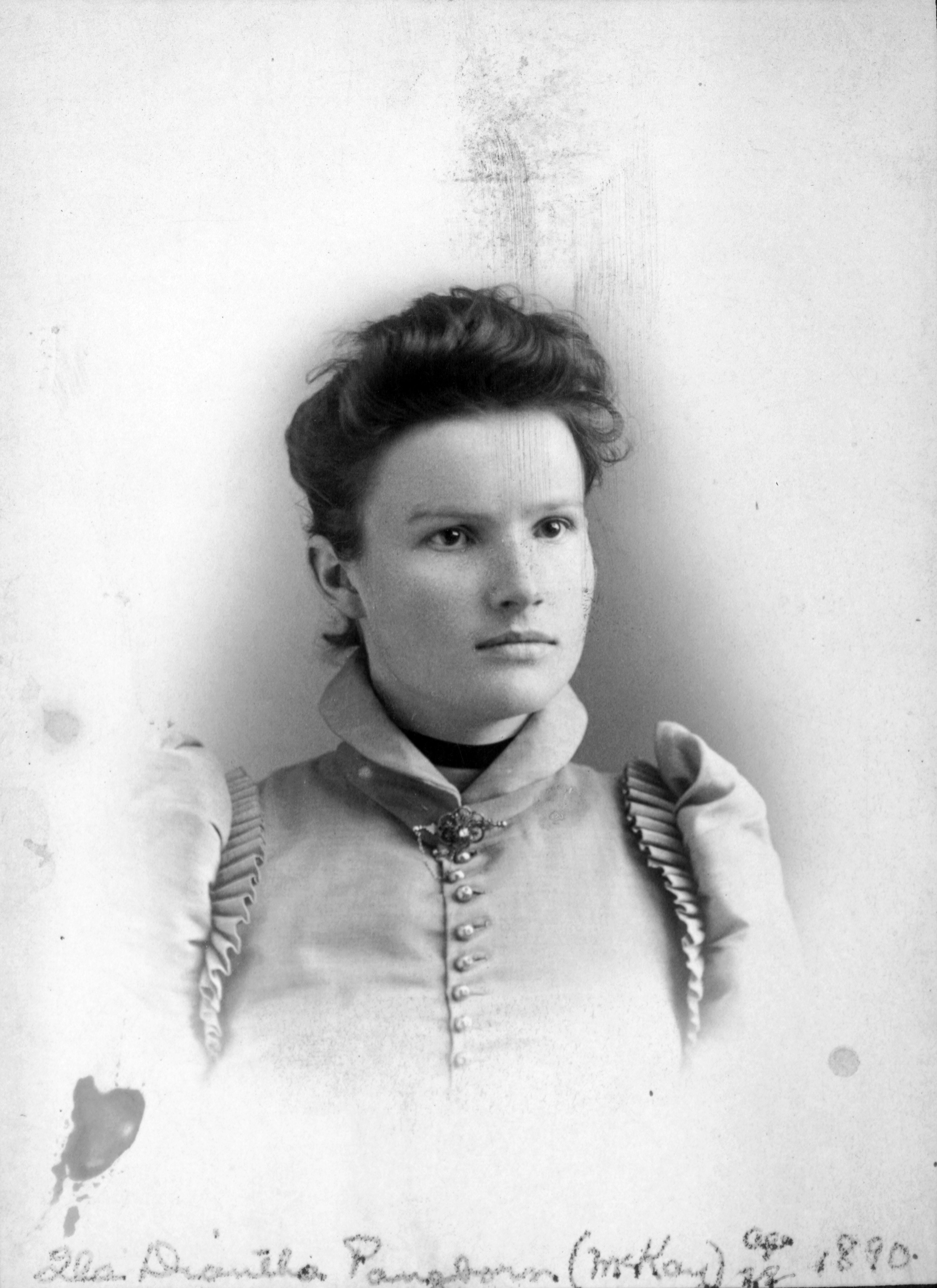Y: 1890 D: ila diantha pangborn - age 22 C: [front] ila diantha pangborn (m); age 22; 1890 photo: E.E. BERTRAND'S STUDIO - 324 MONROE STREET - SPOKANE FALLS, WASH.