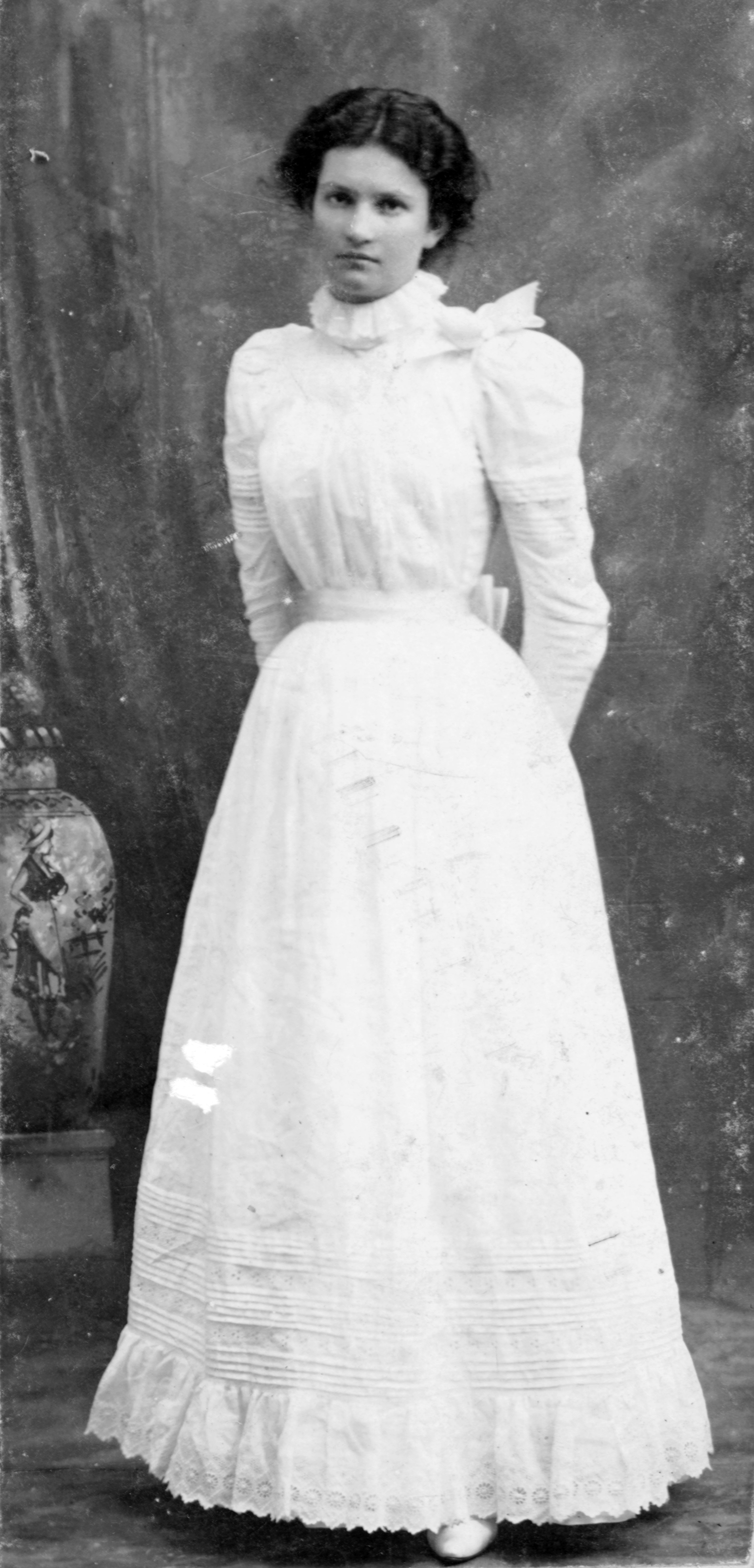 Y: D: mabel pangborn - white dress C: mabel pangborn; sister of my mother; h.s. [?] married to will clark; 2 daughters: beatrice - died age 15?; elnore - never married. label: mabel pangborn; sister of ila diantha pangborn mckay.