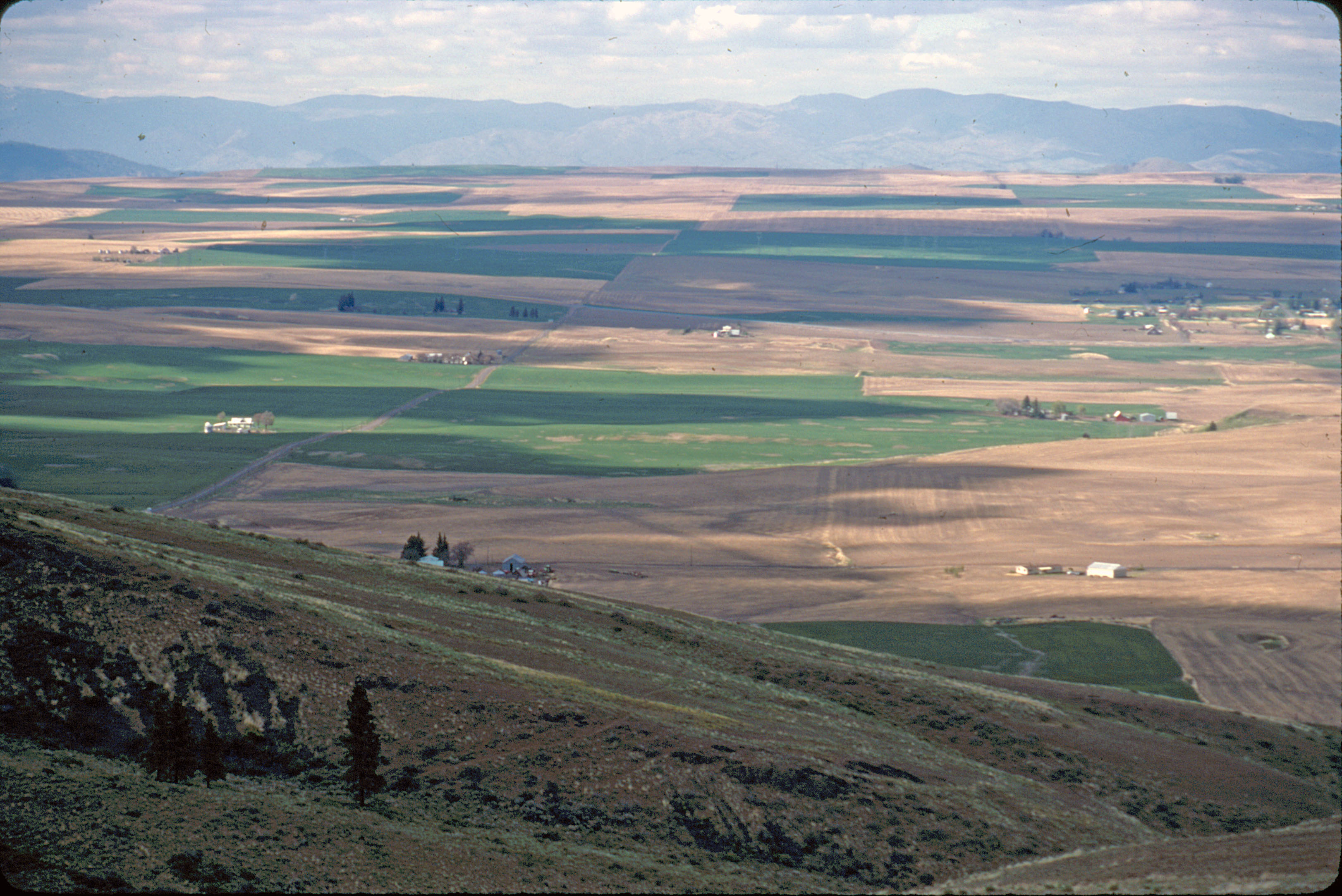 Y: 1985 D: panorama, ranch land west of waterville, from badger mtn, peterson ranch house lower left center [below walt's hill], chelan mtns on horizon, spring 1985 C: panorama, ranch land west of waterville, from badger mtn, peterson ranch house lower left center [below walt's hill], chelan mtns on horizon, spring 1985. photo: from 0.9x1.4 color transparency; 2400 ppi.