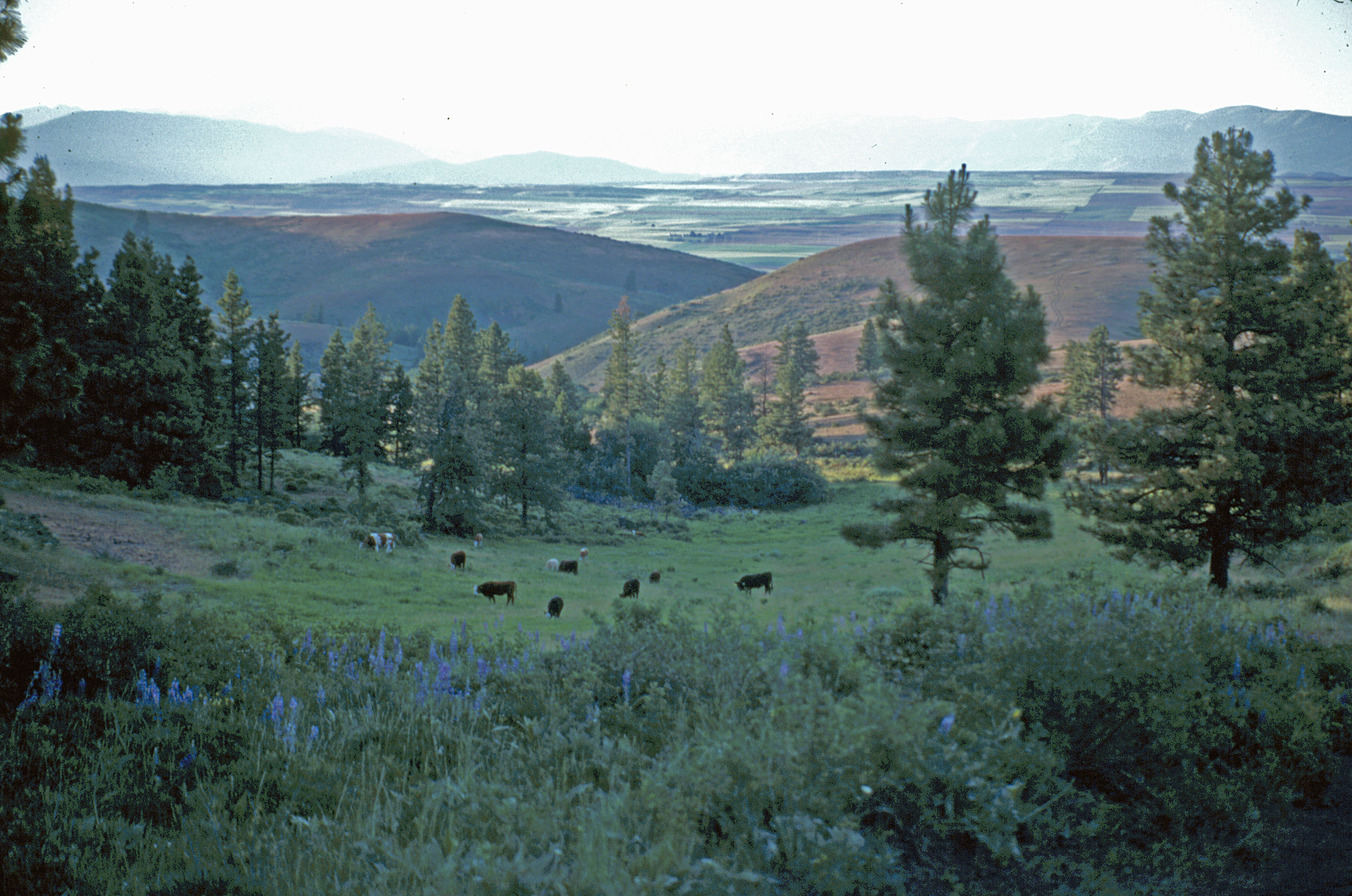 Y: 1986 D: view, north, cattle grazing above sandstrom place, ruud canyon center, tv hill right, walt's hill left center, 1986 C: view, north, cattle grazing above sandstrom place, ruud canyon center, tv hill right, walt's hill left center, 1986. photo: from 0.9x1.3 color transparency; 2400 ppi.
