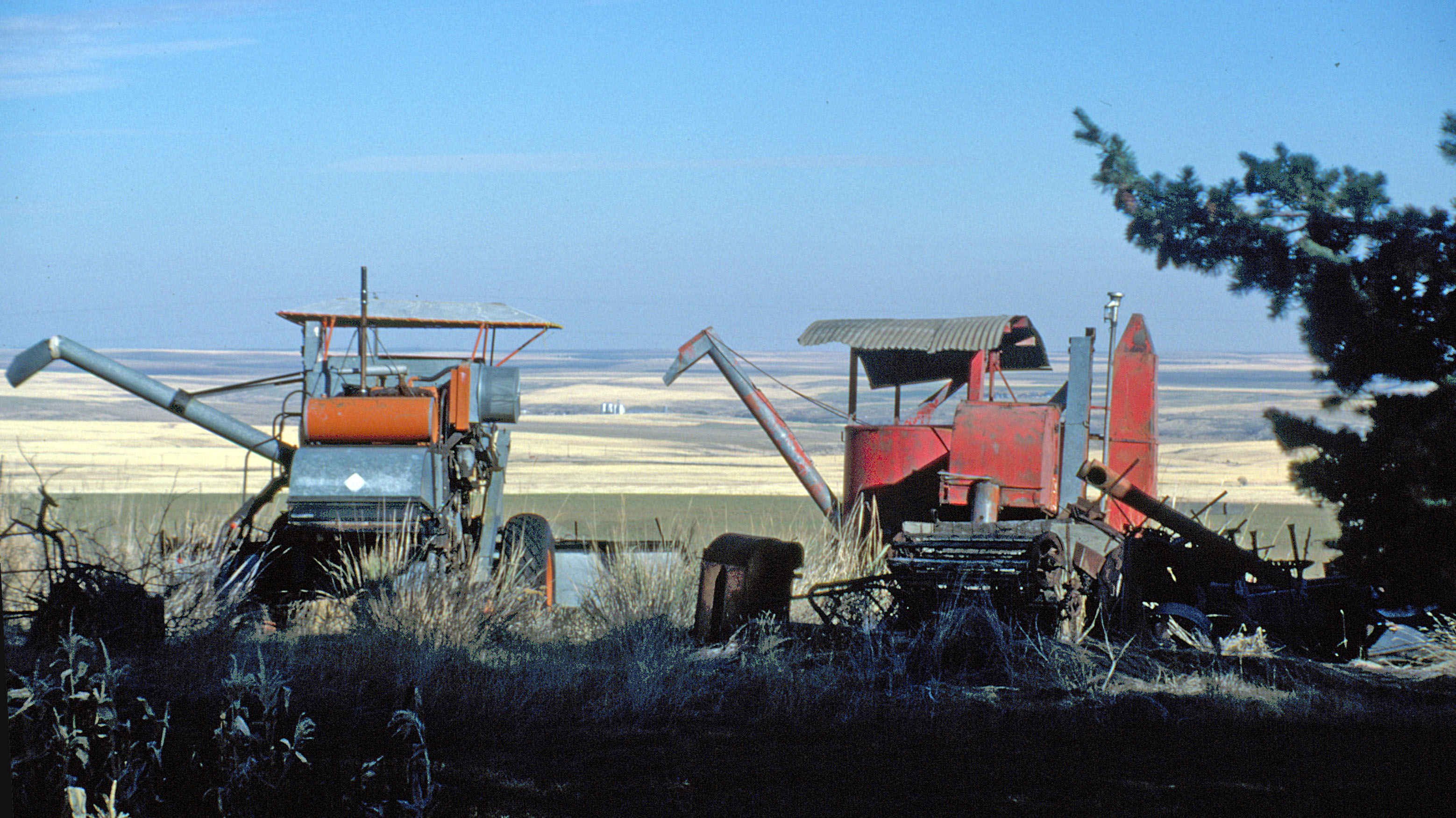 Y: 1985 D: ranch, old combines, douglas grain elevators beyond, fall 1985 C: ranch, old combines, douglas grain elevators beyond, fall 1985. photo: from 0.7x1.3 color transparency; 2400 ppi.