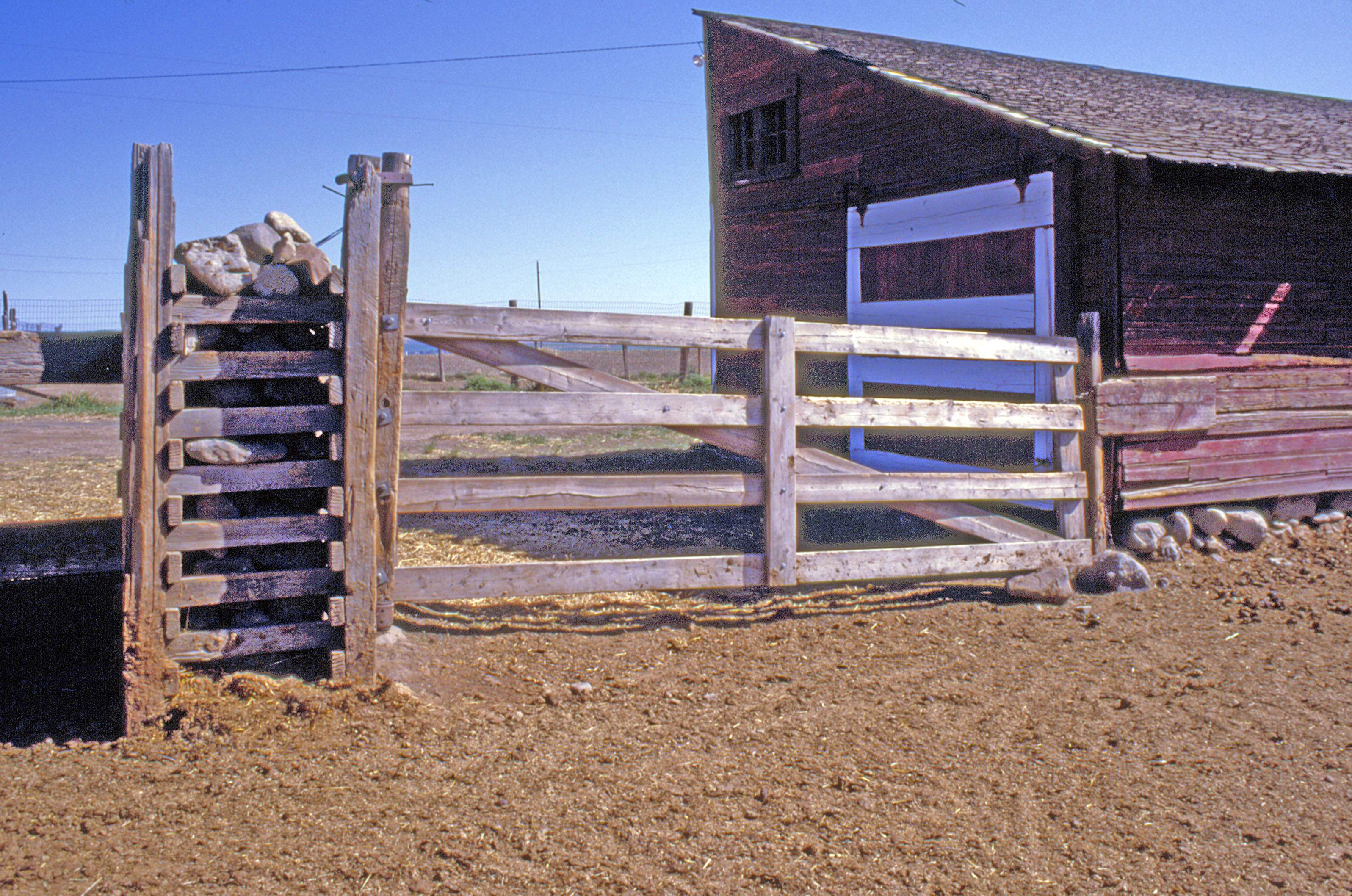 Y: ca 1985 D: ranch, rock fence post, gate, horse barn, ca 1985 C: ranch, rock fence post, gate, horse barn, ca 1985. photo: from 0.9x1.3 color transparency; 2400 ppi.